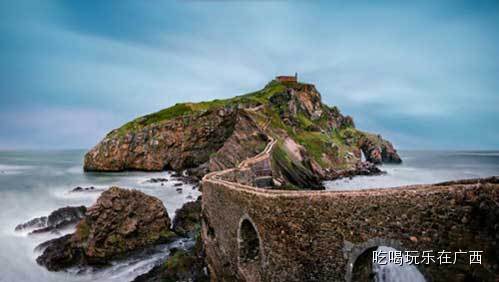 西班牙的龙脊海岸(Gaztelugatxe),远看桥就像蜿蜒的龙身,岛上座落的修道院院外有口吊钟,传说和心上人走完这237个台阶一起敲钟,两人的爱至死不渝。