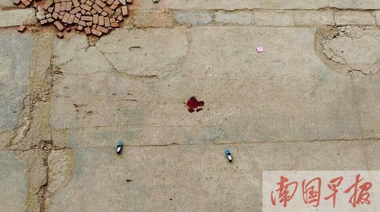 事发现场留下一摊血迹和一双蓝色平底鞋。见习记者 黄一倍摄