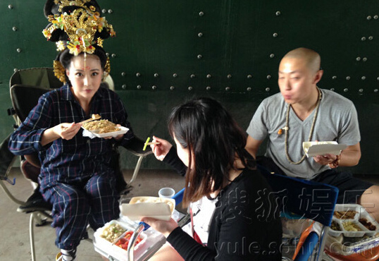 搜狐娱乐讯 日前,周海媚在《武媚娘传奇》中的戏份刚刚完结,她在片场穿居家服吃盒饭的照片也曝光。只见她顶着剧中华丽头饰,却随意穿着格子居家服、清凉板儿拖,开心的和工作人员一起吃盒饭,也不避讳的笑看镜头,可见女神心好大,为工作也变女汉子。