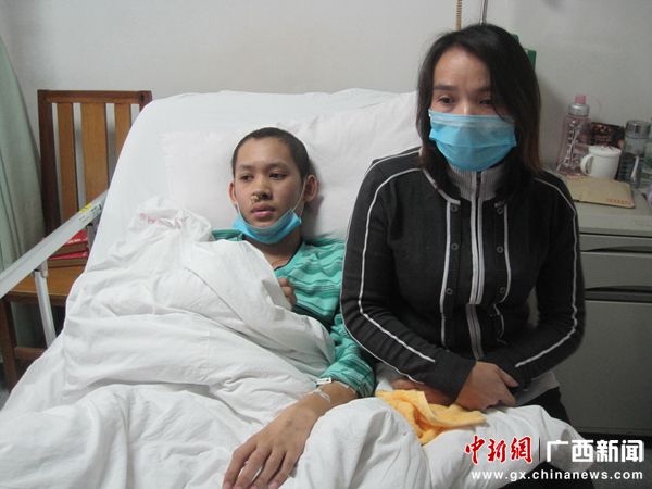 覃光俊妈妈黄丽红在病房照顾覃光俊