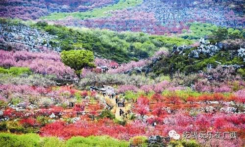 阳春三月,桃花盛放绵延十里,如同满山红霞,十分壮观。每年3月恭城桃花节期间,人们来此踏青赏花,载歌载舞,以舞会友,以花传情,感受春天气息。