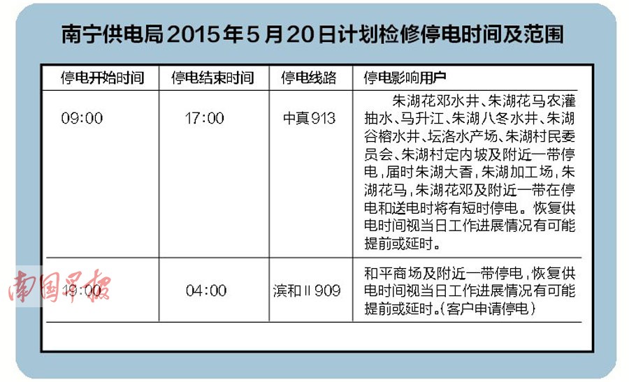 南宁供电局2015年5月20日计划检修停电时间及范围
