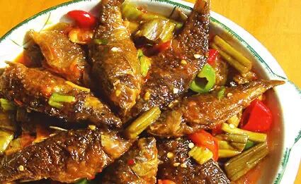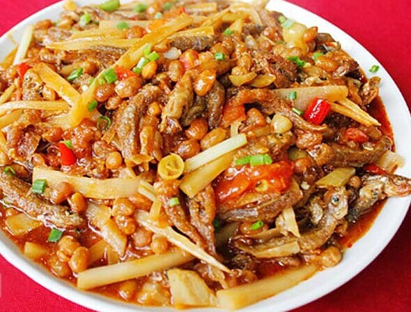 酸笋送粥,鼎锅要哭;鱼仔送饭,鼎锅刮烂。炒香葱、姜、蒜、红辣椒及酸笋后,放入小鱼仔、黄豆,焖熟即可。小鱼仔来自柳江,主要有“爬地狗”(又名哈巴鱼)“船丁鱼”“拦刀鱼”。制作要领有两条:酥香的小鱼仔,需要下两轮油锅;起锅前再放入油炸黄豆。