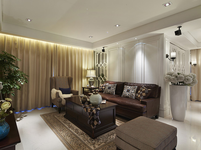 整体呈现清新美式风格。房间以白色打底,各色家具既发挥其本质功能,又起到装饰作用。首先房间吊顶经过精心设计,营造出层次感;其次在细节上来彰显美式风格,各种灯饰、装饰品、包括床的造型等等都融入美式设计。