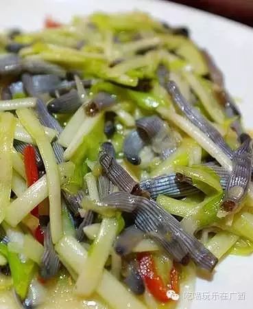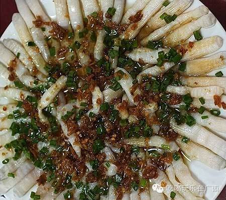 泥丁生活在海边的淤泥里,颜色比沙虫黑,但味道同样鲜美,防城港一带的沿海生长较多,是防城港的一道特色名菜。