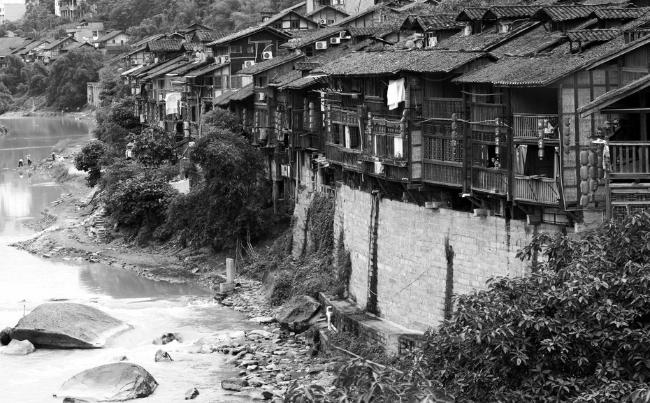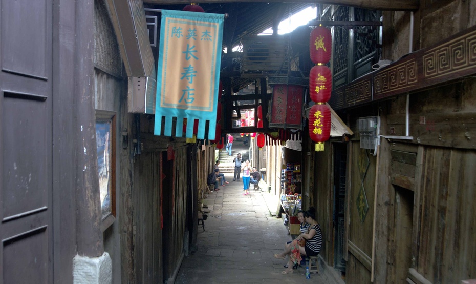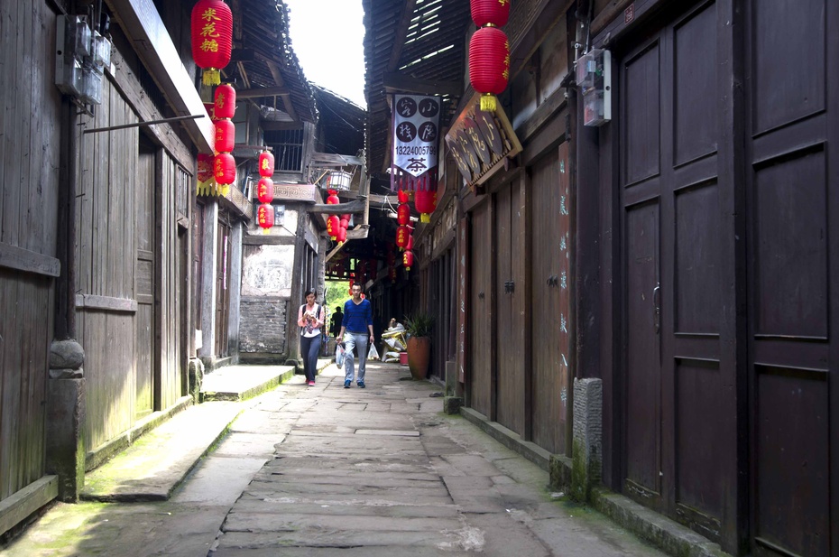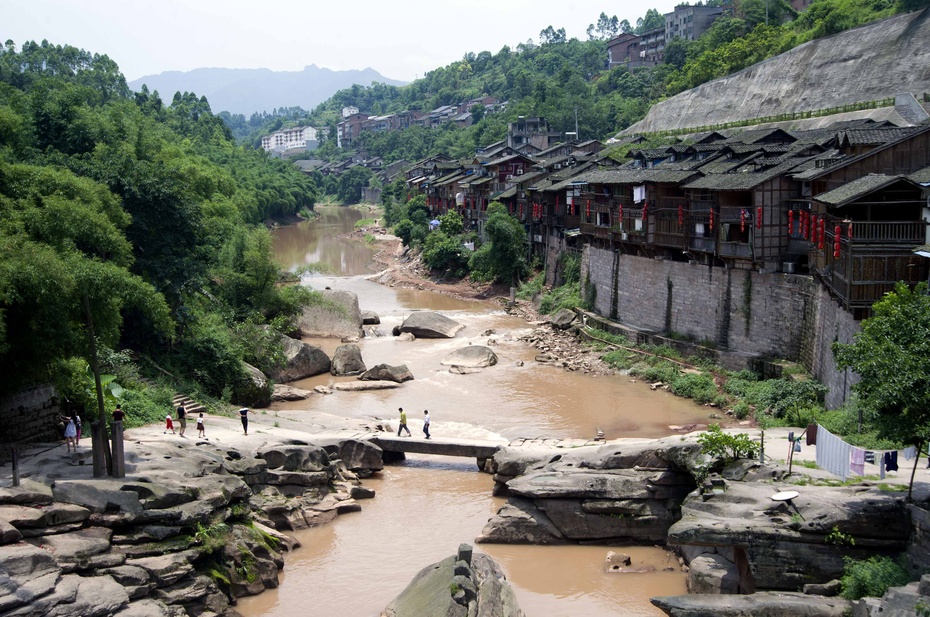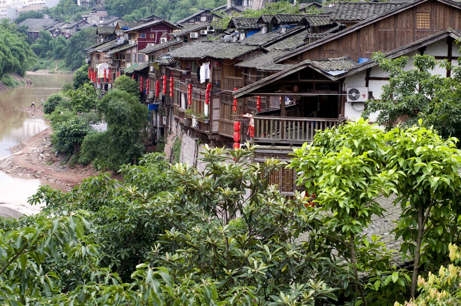 古镇依河而建,仅一条长三公里的狭窄老巷。这里的建筑多为两层“吊脚楼”,大多以石为基,结合木.竹等材料创造出独一无二的干栏式建筑群落,使场镇无论处于山坡险滩,均能完美地融入自然中去,散发出人文与自然共处和谐的一派毫不造作的儒雅气质。木楼以清朝建筑为主,依山势形成的商街层层递进,其风雨场的过街建筑几乎都是能遮风避雨不见天日的“封闭式”建筑,由此设计,充分考虑到了川东地区雨晴不定的特点,算是巴渝古镇中非常独特的一个场镇。小镇内街空高约6—8米,上面的木梁结构至今仍十分牢固。整座古镇都是青色瓦片盖顶,红漆木板竹篾夹墙,圆柱承重,地面的青石板,古朴凝重中透出原汁原味的巴渝人家风韵。