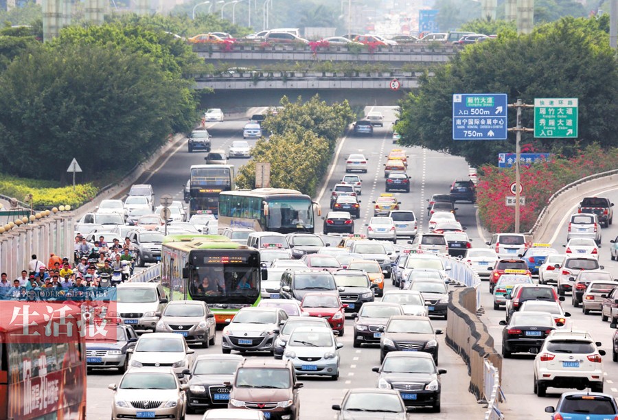 ”放假,让不少人又有了自驾出游和回家团聚的时间。4月17日17时30分左右,在南宁市民族大道东段出城方向,开始聚集了不少出城的车辆,出现了车流高峰。图为4月17日傍晚时分,在民族大道竹溪立交桥出城方向车辆出现拥堵。记者 周军 摄(广西新闻网-当代生活报)